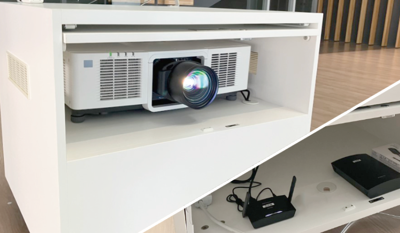 16,500lmの高輝度プロジェクターは移動式ラックに収納。裏下段にはワイヤレスプレゼンシステムを設置している。