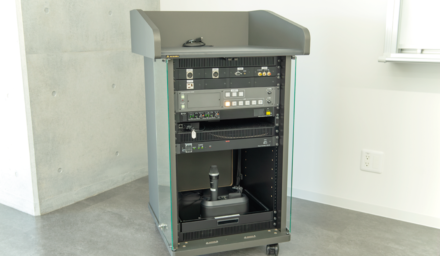 レクチャーキャビネットには、デジタルマルチスイッチャーとデジタルワイヤレスマイクを収納している。