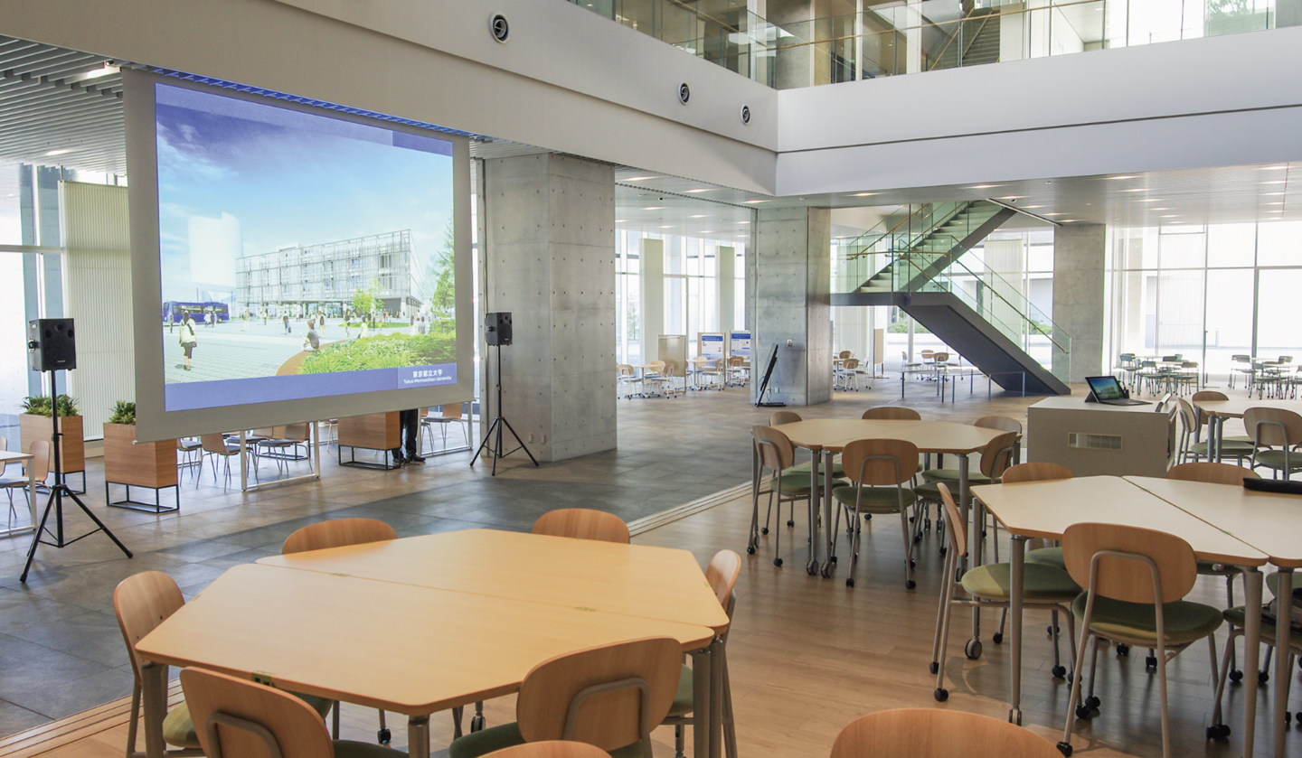 東京都立大学様では、2023年に竣工した新棟を同年10月に6号館としてオープン。そのエントランスに位置する「オープンイノベーションスペース」をはじめ、セミナールームや講義室の映像・音響システムを整備させていただきました。