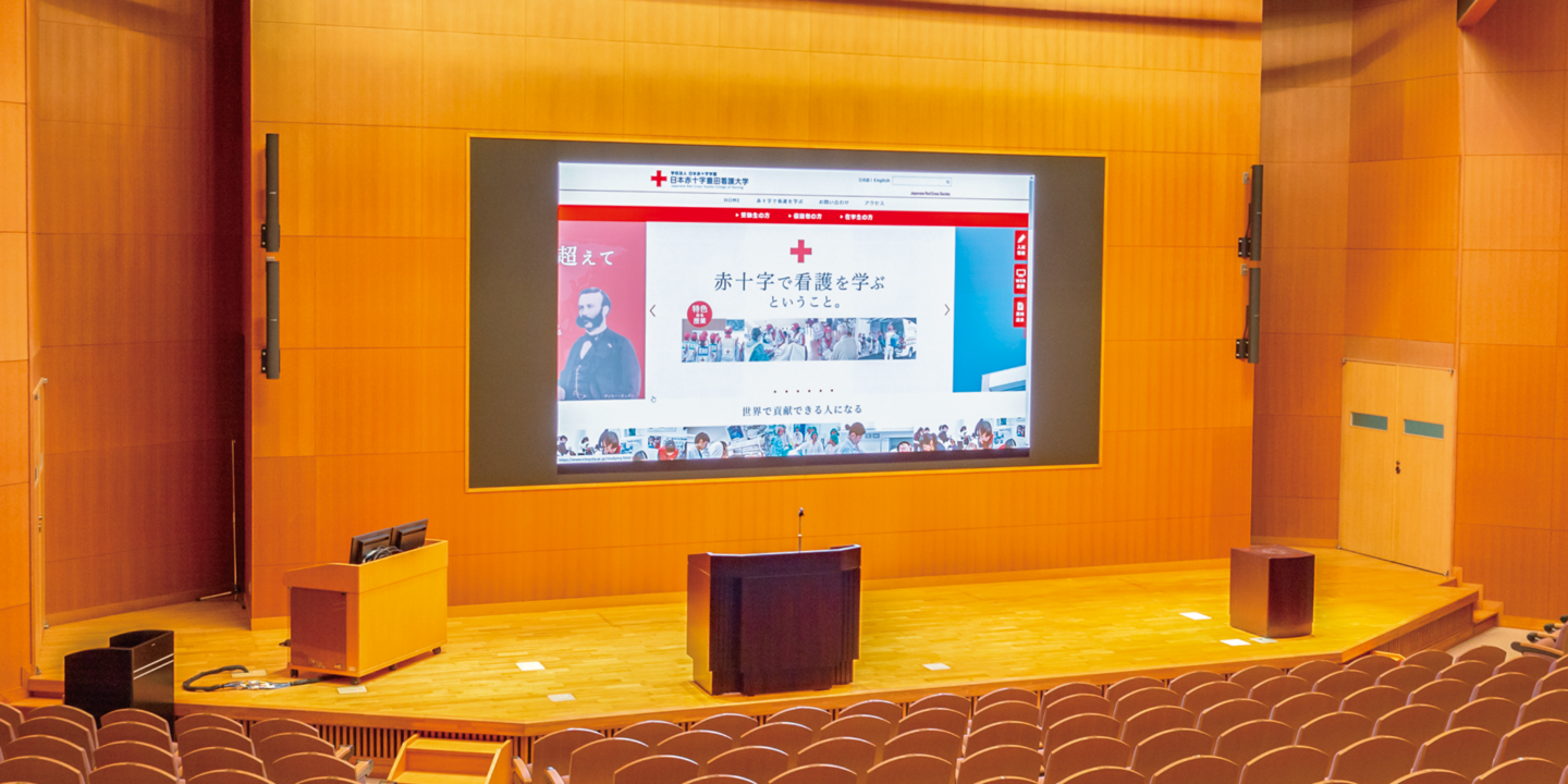 日本赤十字豊田看護大学様は、2004年に豊田市に開設し、2023年に開学20周年を迎えました。その記念事業の一環として、講堂の映像・音響システムを更新することになり、大型LEDビジョンを含む環境を整備させていただきました。