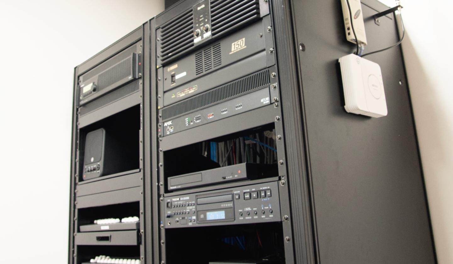 ブルーレイプレイヤーや4Kデジタル入力レコーダーなどが調整室のラックに設置されている。