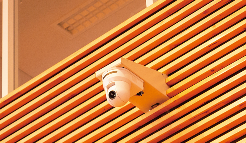 講堂に2台あるリモートカメラの1つは後方上部の調整室の前に設置されている。