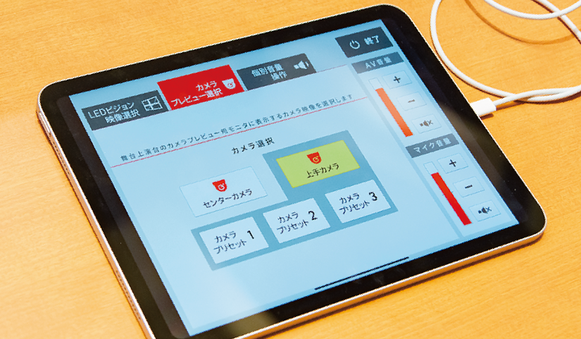 講堂のシステムは、タブレット端末でコントロールするので、講堂の客席からでも映像・音響操作が可能。同様のシステムが、講堂の後方上部にある調整室にも設置されている。